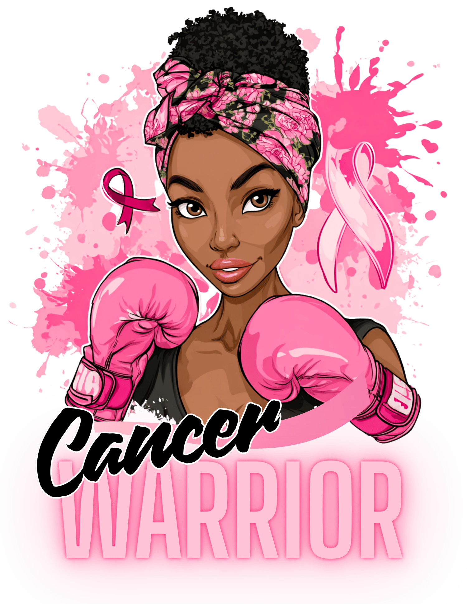 Show your strength and resilience with this Cancer Warrior design, featuring a powerful illustration of a confident African American woman in pink boxing gloves, ready to fight. The vibrant pink awareness ribbon and bold splash background make it perfect for breast cancer awareness month, survivor gifts, and fundraising projects.