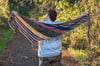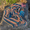 The finished shawl dimensions are approximately 23” deep with a 7’ wingspan. For a smaller shawl, you can omit 2 or 3 repeats of the narrow stripes. There are no tails to weave in on this project. Leave 6 inch ends when changing colors. These will be the beginning of the fringe side of the shawl.
