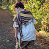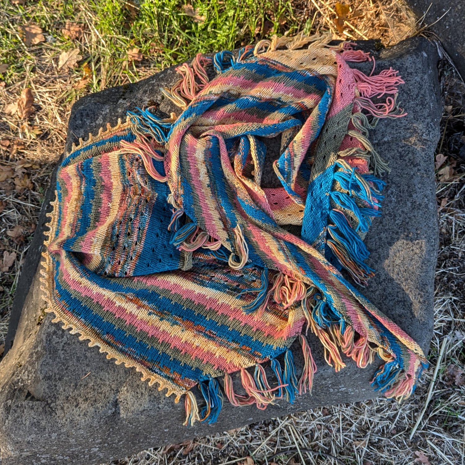 The They/Them shawl is an asymmetrical boomerang shawl with stripes, slipped stitches, eyelets, fringe, and plenty of movement. Using five colors in a fingering weight yarn and creating a boomerang shape, this shawl is more than just a fun piece to create. It is a statement that fiber arts can welcome everyone with a shared love of color, texture, and pattern.