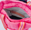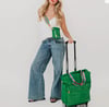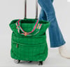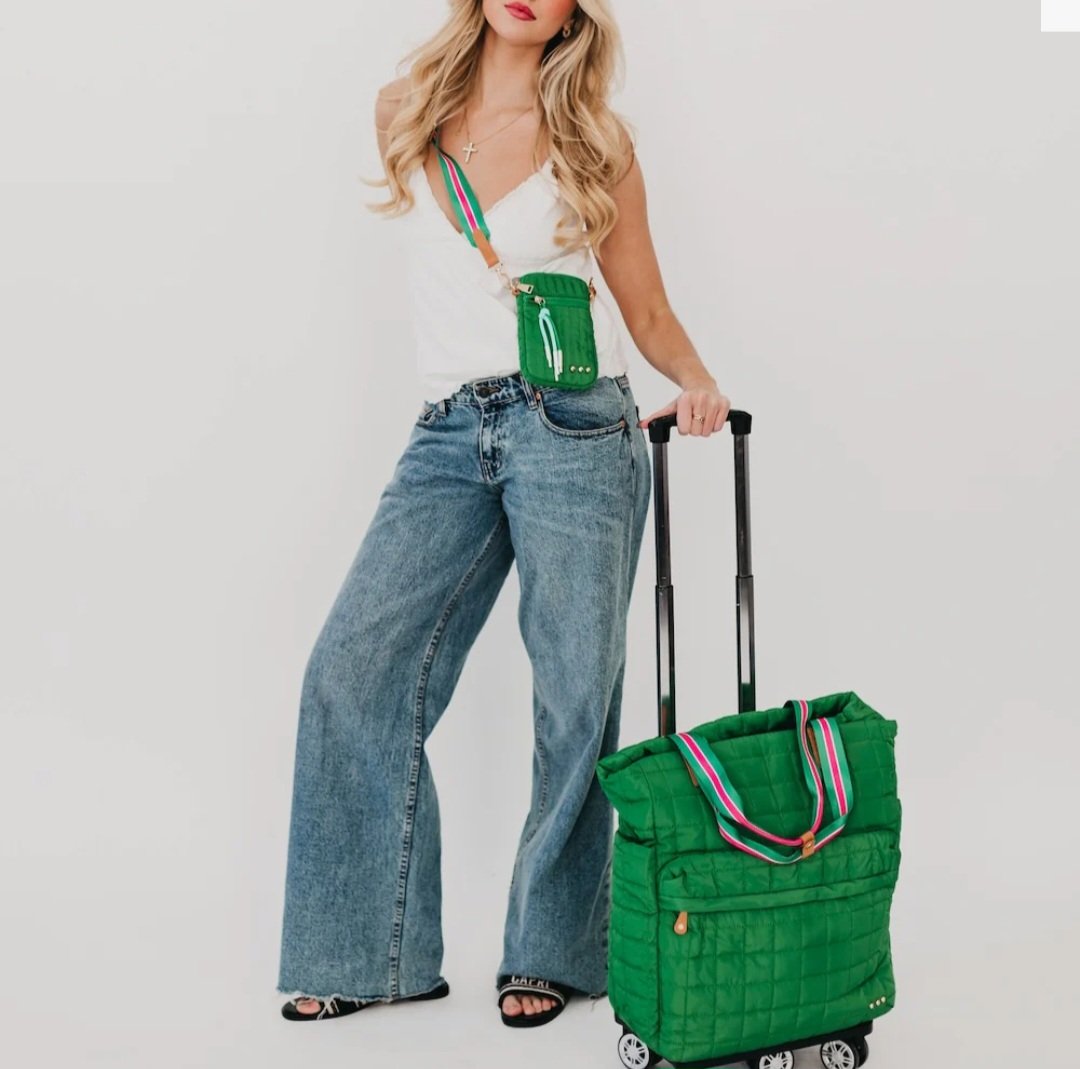 Dual handle. Quilted puffer nylon tote bag. Has numerous pockets and compartments. Has 5 wheels.
