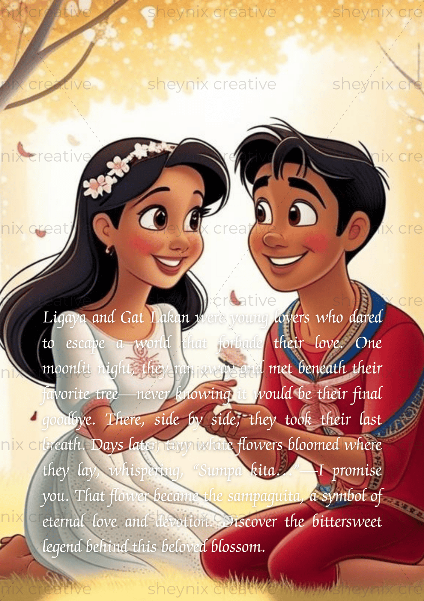 A heartfelt legend about a couple's unwavering love and promise, whose devotion gave rise to the delicate and fragrant national flower of the Philippines—the sampaguita.