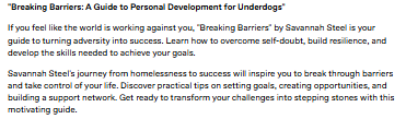 If you feel like the world is working against you, "Breaking Barriers" by Savannah Steel is your guide to turning adversity into success. Learn how to overcome self-doubt, build resilience, and develop the skills needed to achieve your goals.