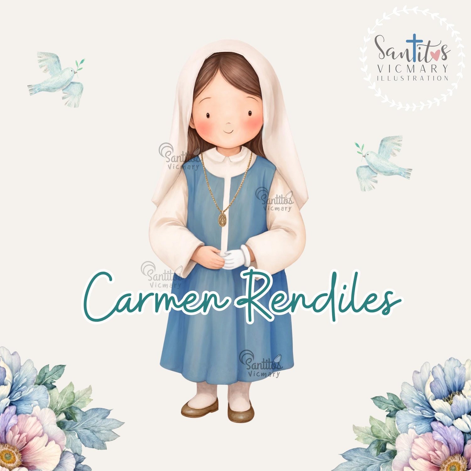 1x Ilustración completa con fondo: La imagen principal de la Beata Carmen Rendiles con un sutil fondo decorativo, lista para imprimir o usar en redes sociales.