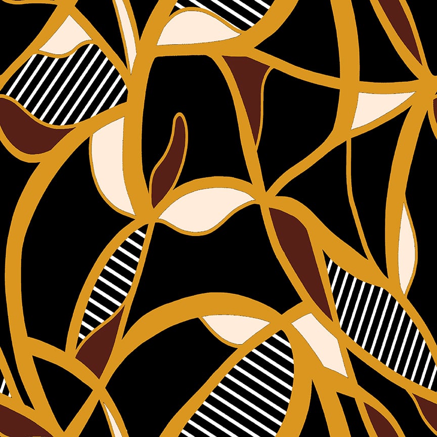 Curved interwoven shapes in black, white, beige & mustard with striped accents
