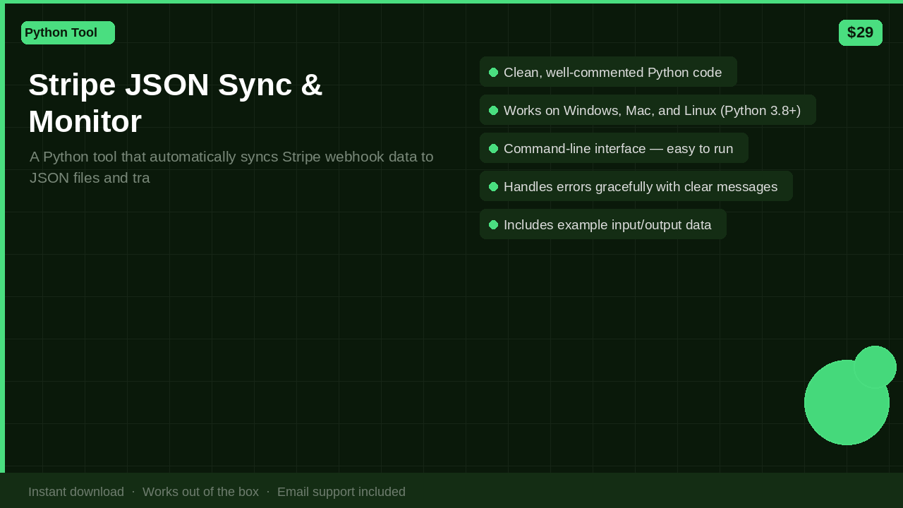 A Python tool that automatically syncs Stripe webhook data to JSON files and tracks changes over time. Built for developers and small businesses using Stripe who need to monitor payment data changes without building custom infrastructure.