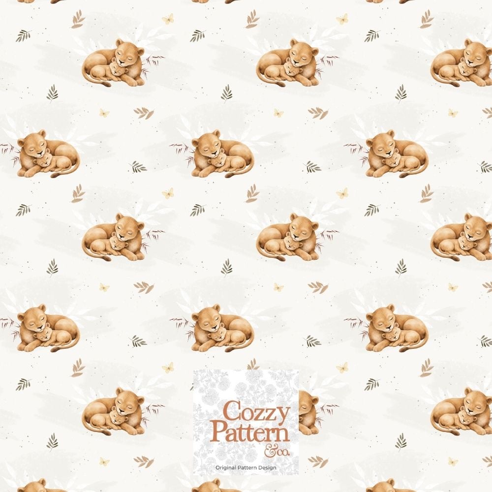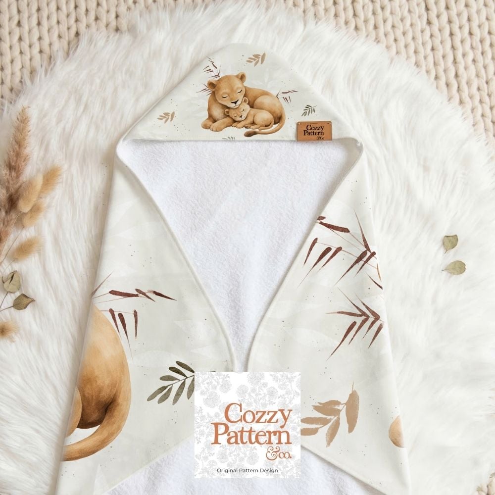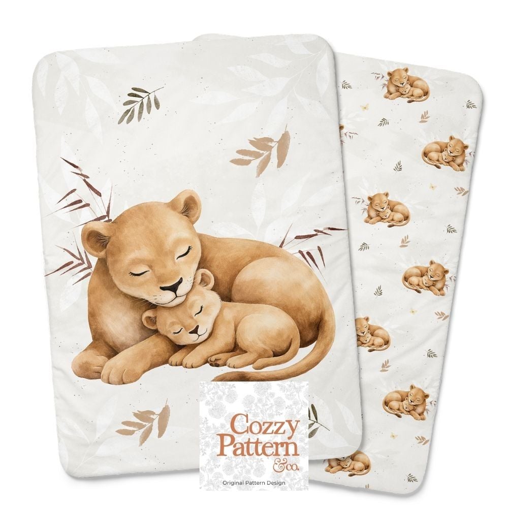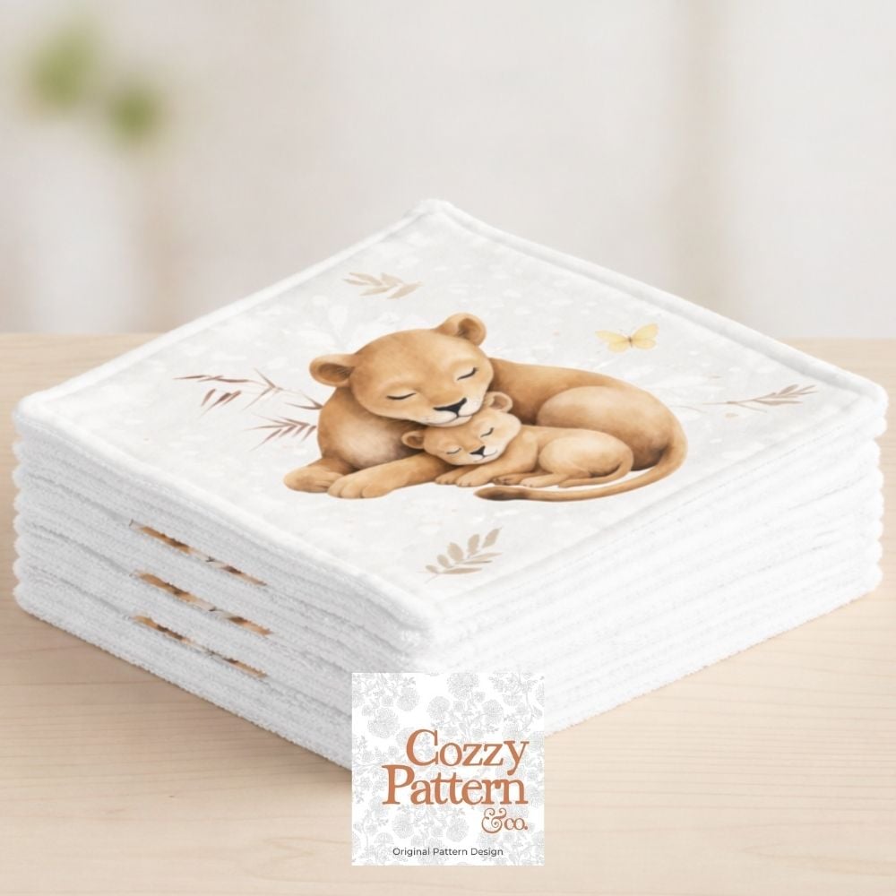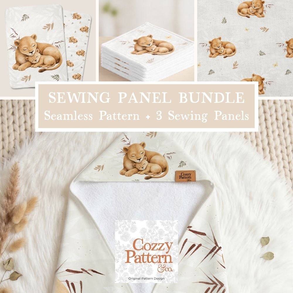 Sleeping Lion Cub Sewing Panel Bundle – Seamless Pattern + Baby Blanket, Bath Cape & Washable Wipes Panels | Commercial License