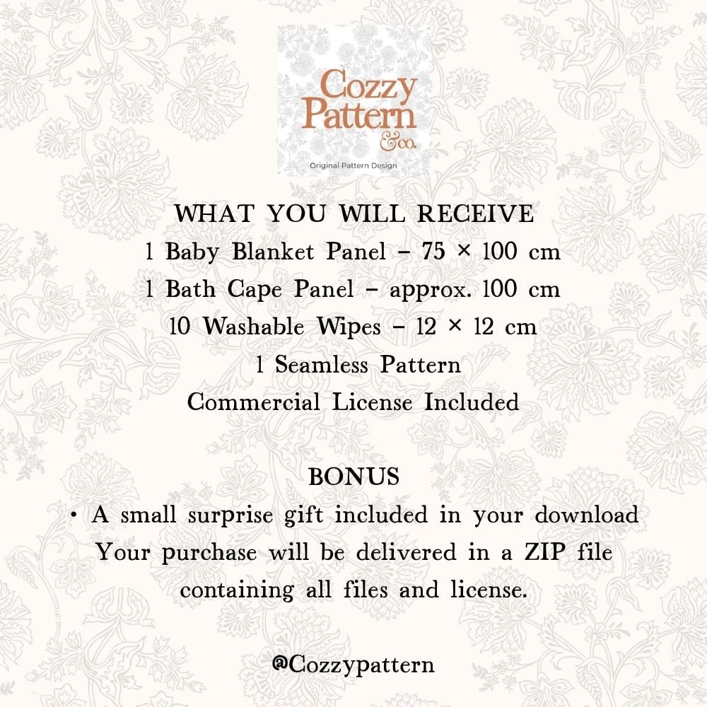 This bundle includes a seamless pattern and three coordinated sewing panels designed for baby creations such as blankets, bath capes and reusable wipes.