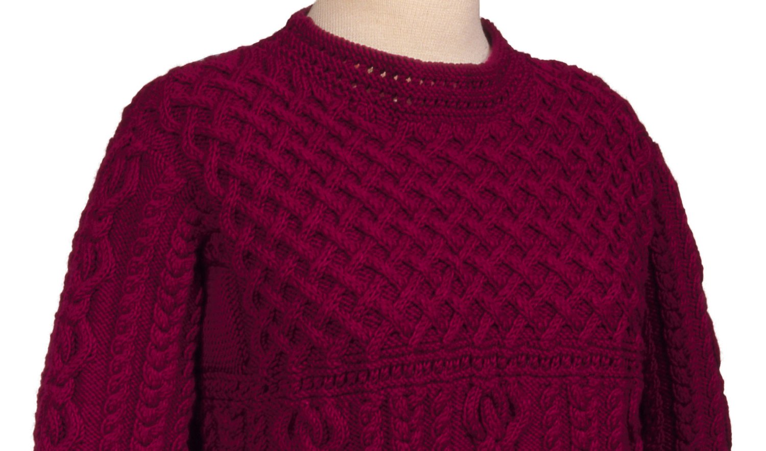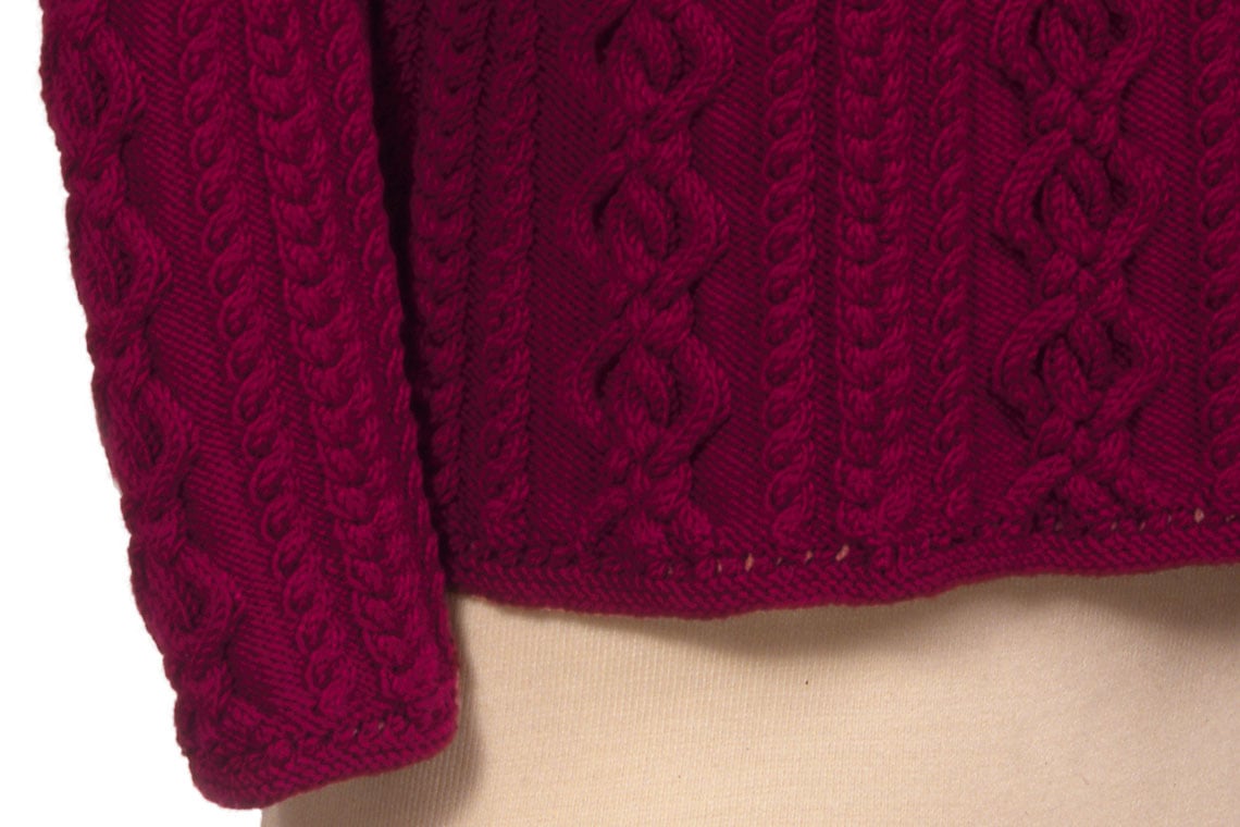 I’ve always loved the lattice stitch and thought it would make a lovely yoke for a sweater. I think it looks beautiful with the basket lattice framed by simpler cables. I used the Ridged Eyelet Border to separate and define the yoke and body, as well as to finish the neck, cuffs and hem. It’s such a simple stitch but it makes a big impact. This pullover is worked from the bottom up in pieces, then sewn together.