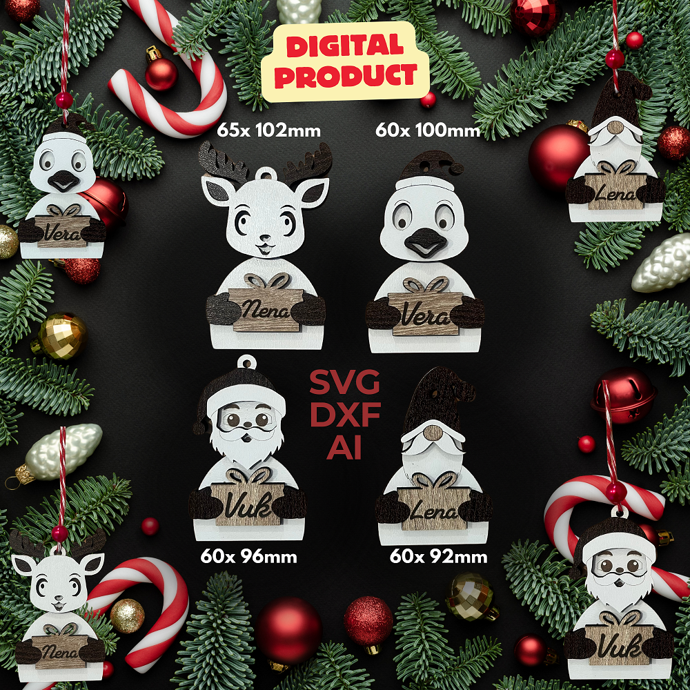 Christmas Decorations Santa Claus,Deer,Gnome,Chicken Personalized With Name - Laser Cut Files I Files for Laser Cutting