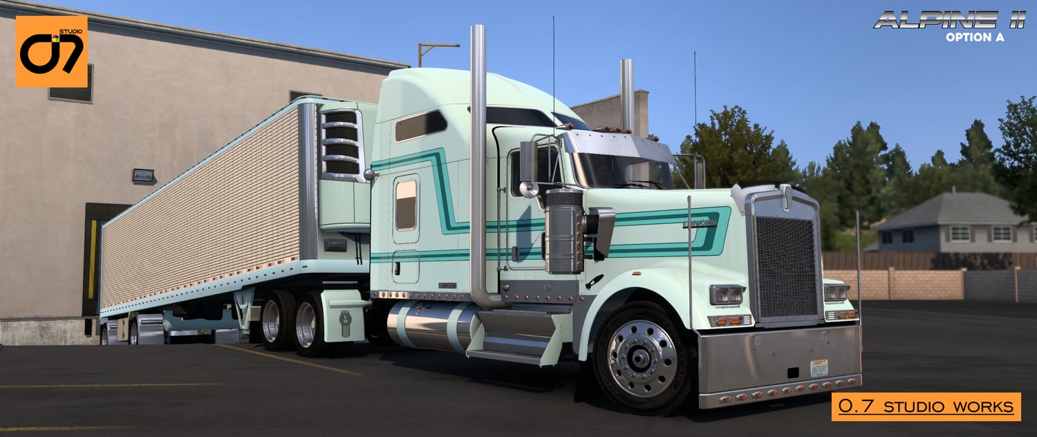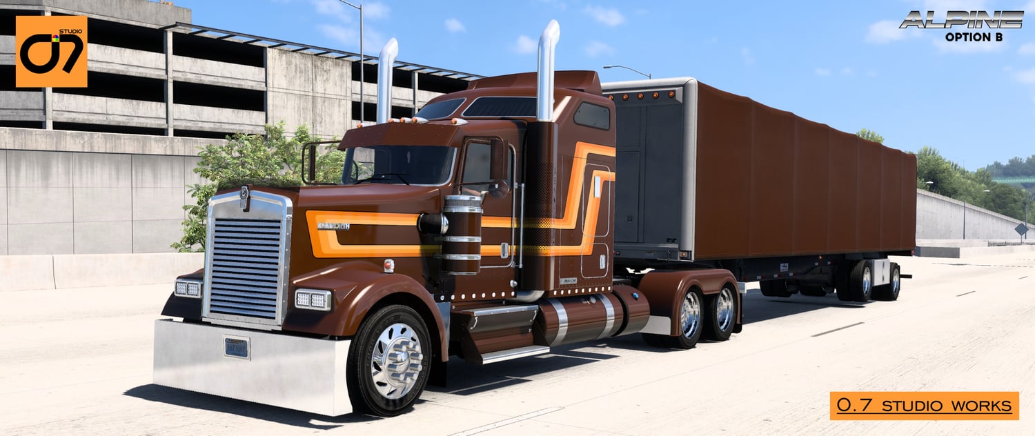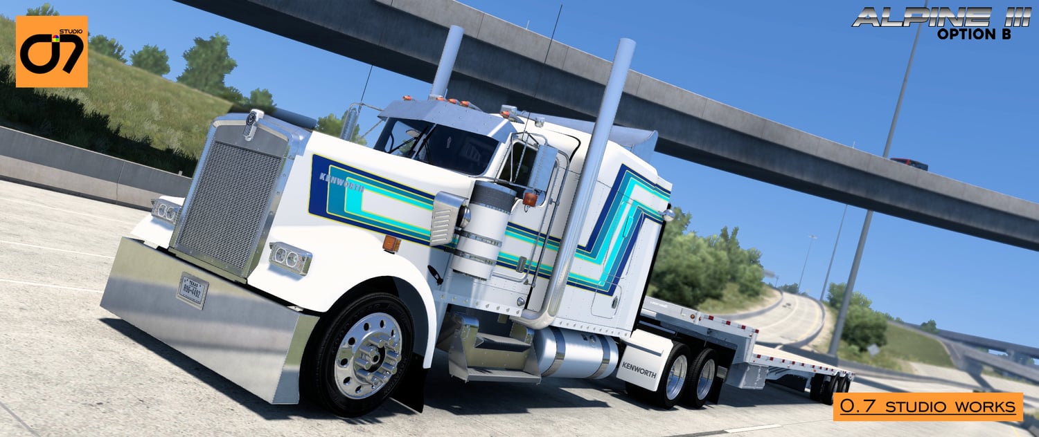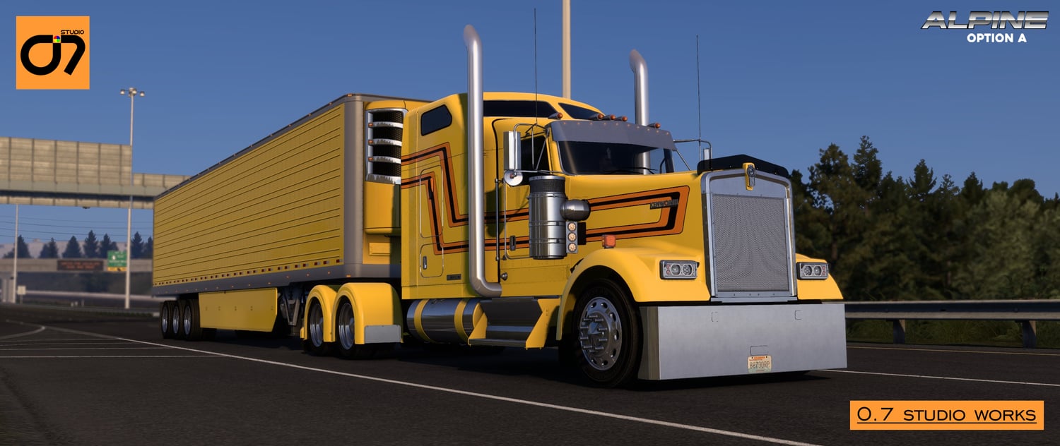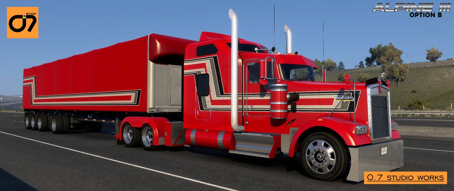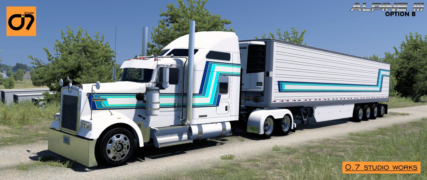 Embark on the ultimate trucking experience with the Alpine Skin Mod from O.7 Studio! This comprehensive collection brings together the finest creations, seamlessly blending classic aesthetics with modern design for the Kenworth W900L.