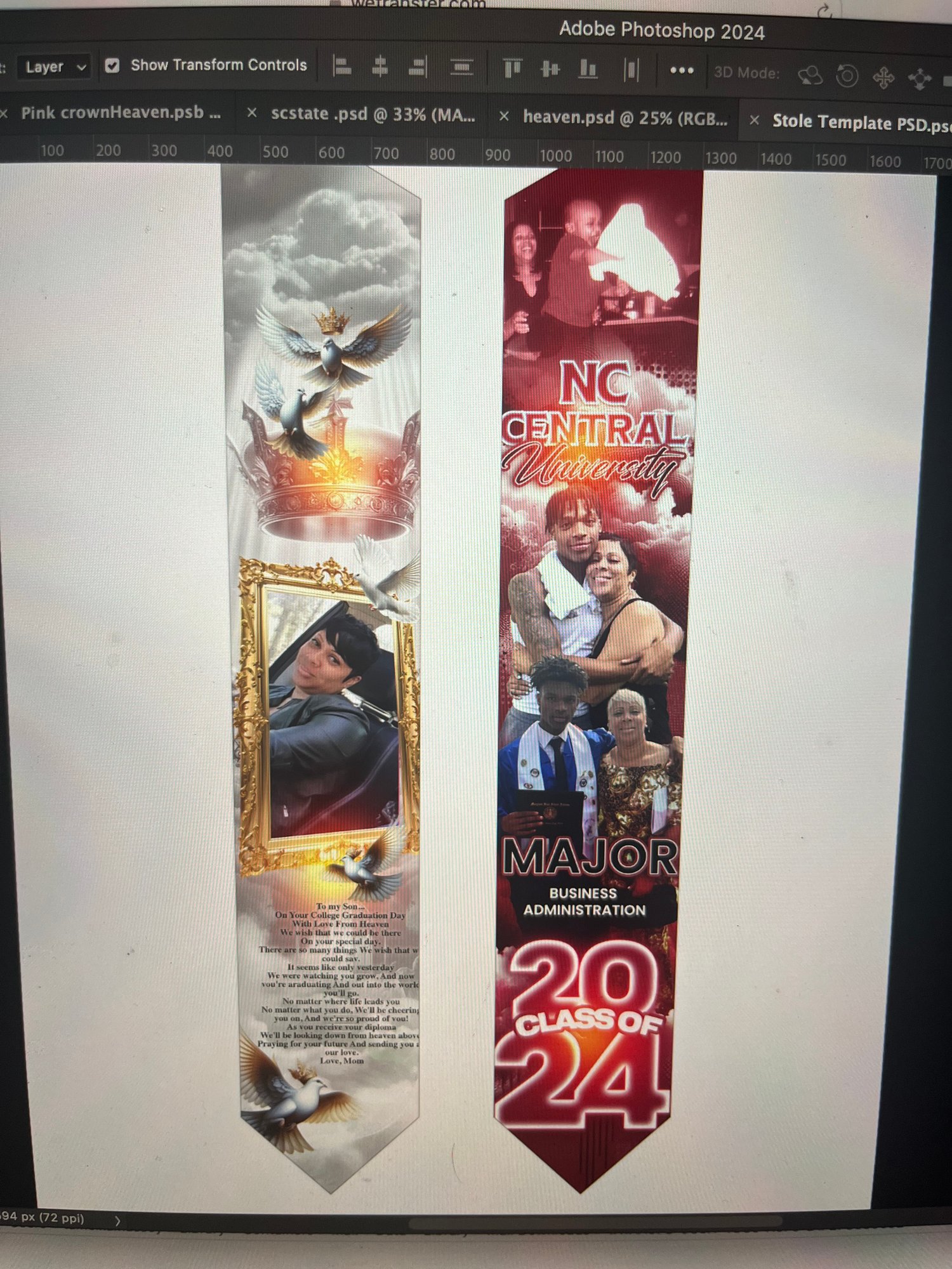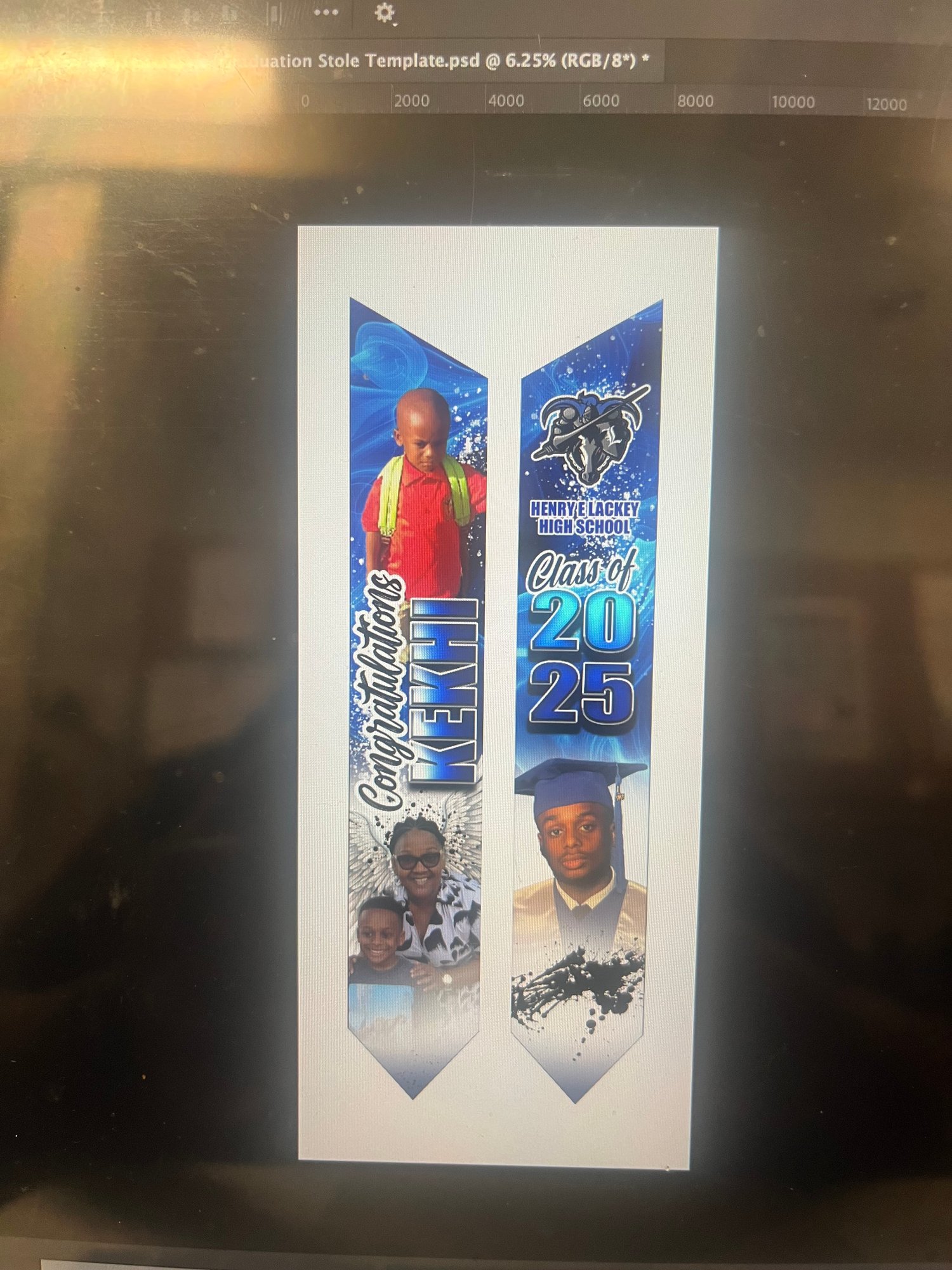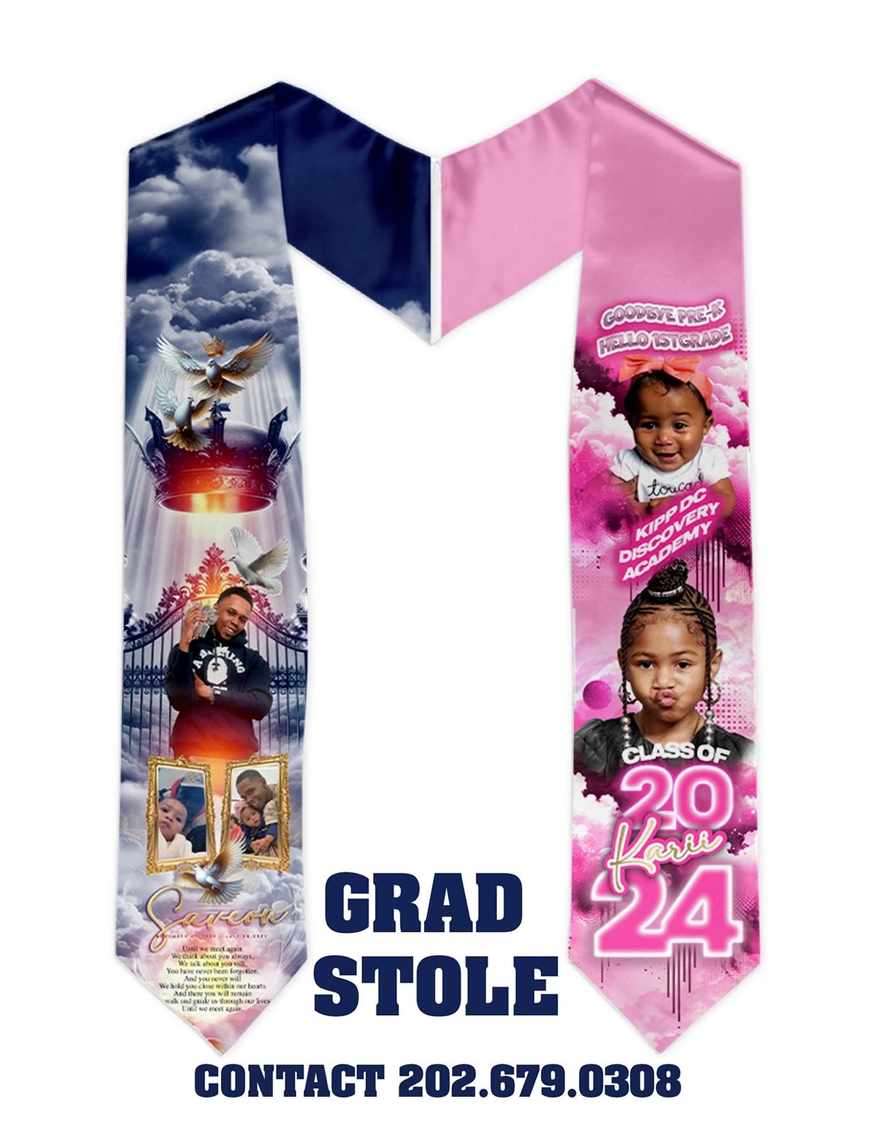 Please be mindful of the pictures you are using and the resolution. Dark pictures will not show clearly on the stoles. Please make sure to send clear high resolution pictures for better quality. This is a FYI.