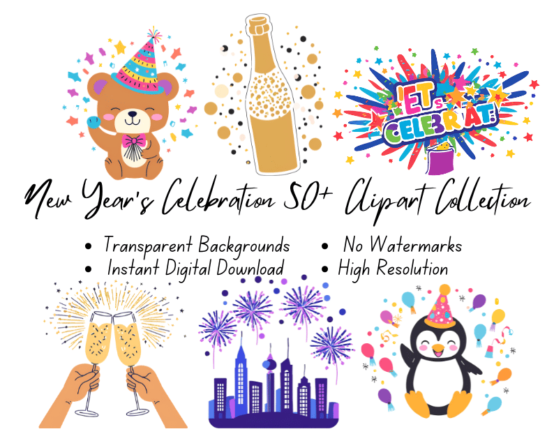New Year's Celebration 50+ Clipart Collection | High-Resolution Digital Printables | Instant Download | No Watermark