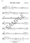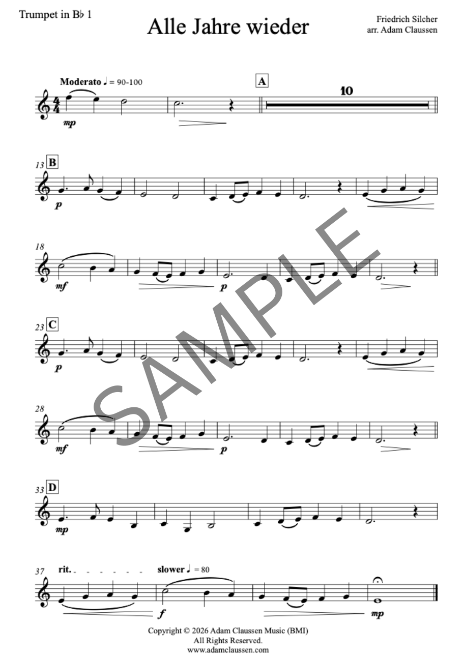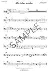 "Alle Jahre wieder" also has lyrics, which can be found on the second page. Although this arrangement was originally written as an instrumental, it may optionally be accompanied by a choir or participating audience singing the lyrics. In this version, verse 1 begins at measure 3, and each subsequent verse has 2 measures of instrumental interlude before the next verse begins. The original song only has 3 verses; therefore in the last section of this arrangement, the lyrics of the first verse should be repeated.