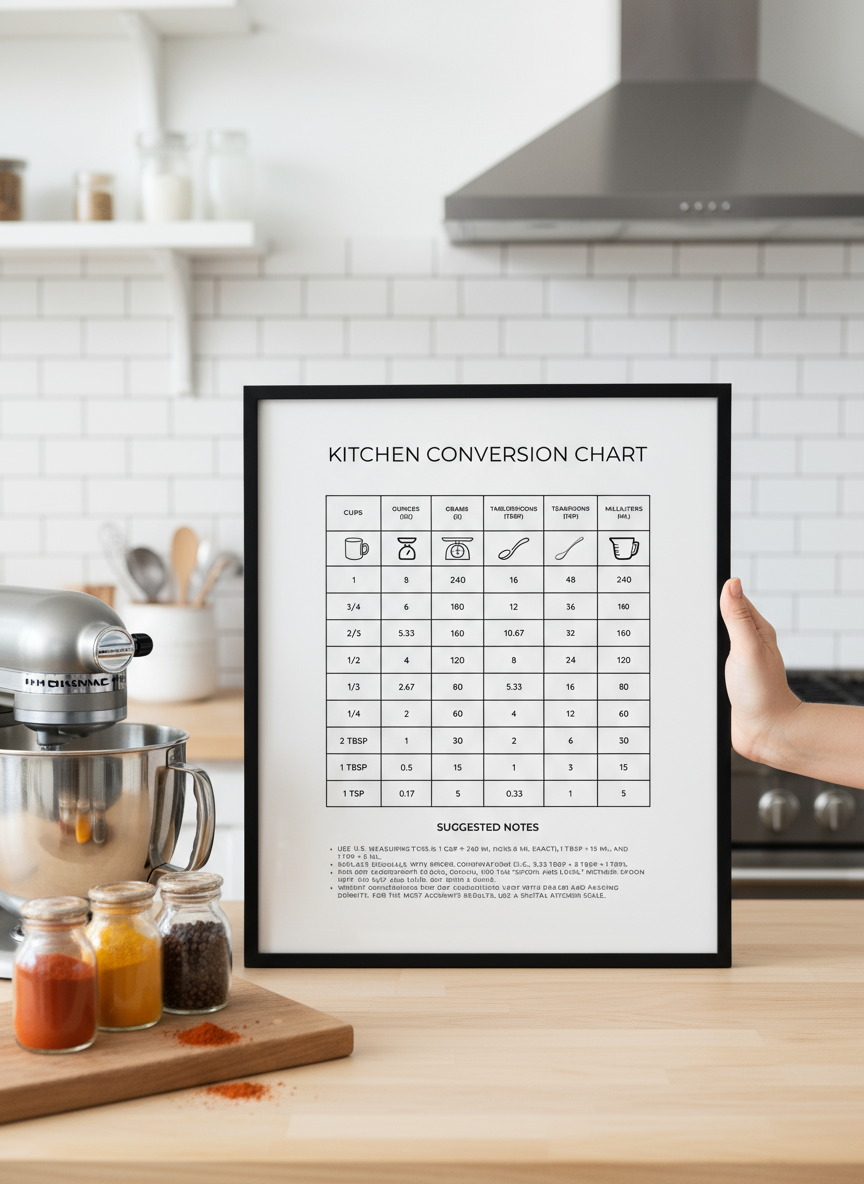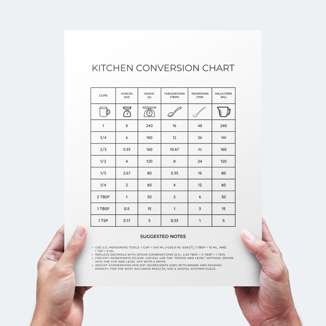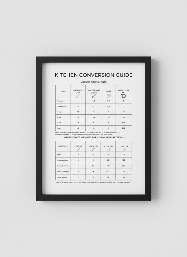 Avoid measurement mistakes and save time with this Kitchen Conversion Chart — a clear, one-page printable that converts cups, tablespoons and teaspoons into grams, ounces and milliliters. Perfect for baking, precise cooking and working with international recipes.