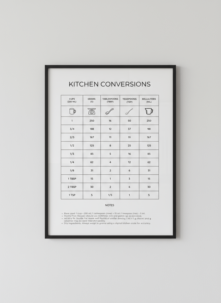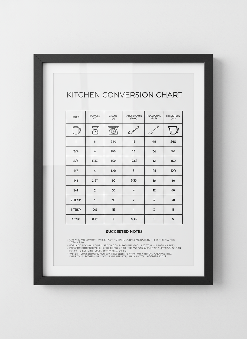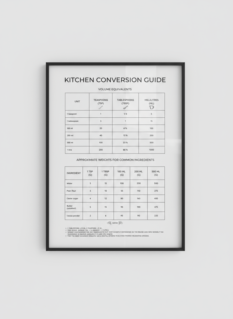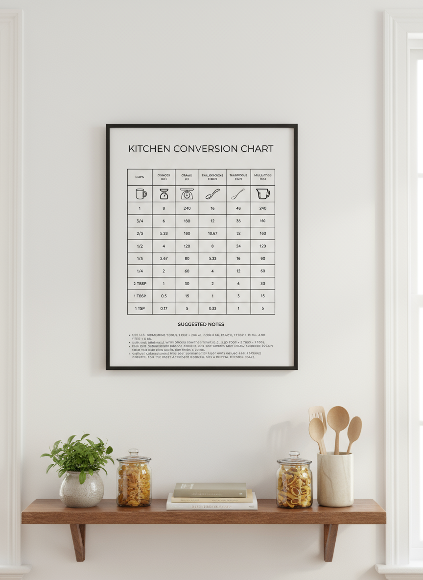 Avoid measurement mistakes and save time with this Kitchen Conversion Chart — a clear, one-page printable that converts cups, tablespoons and teaspoons into grams, ounces and milliliters. Perfect for baking, precise cooking and working with international recipes.