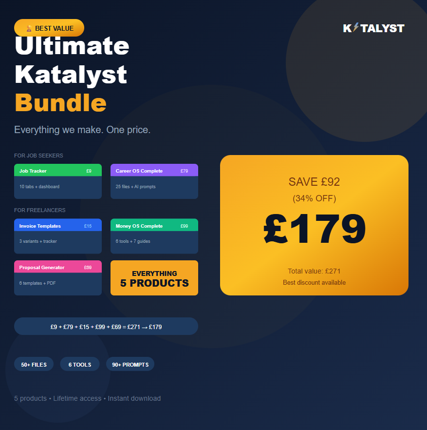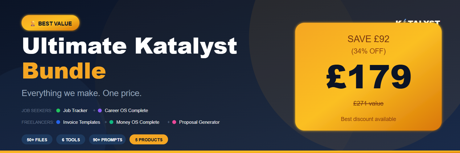 Whether you're job hunting, freelancing, or making the leap from employment to self-employment, the Ultimate Katalyst Bundle has you covered from day one.