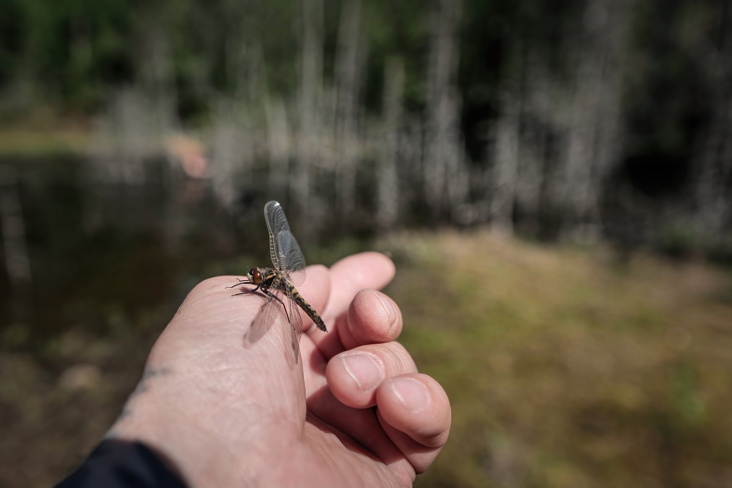 A small dragonfly has landed on the man's hand