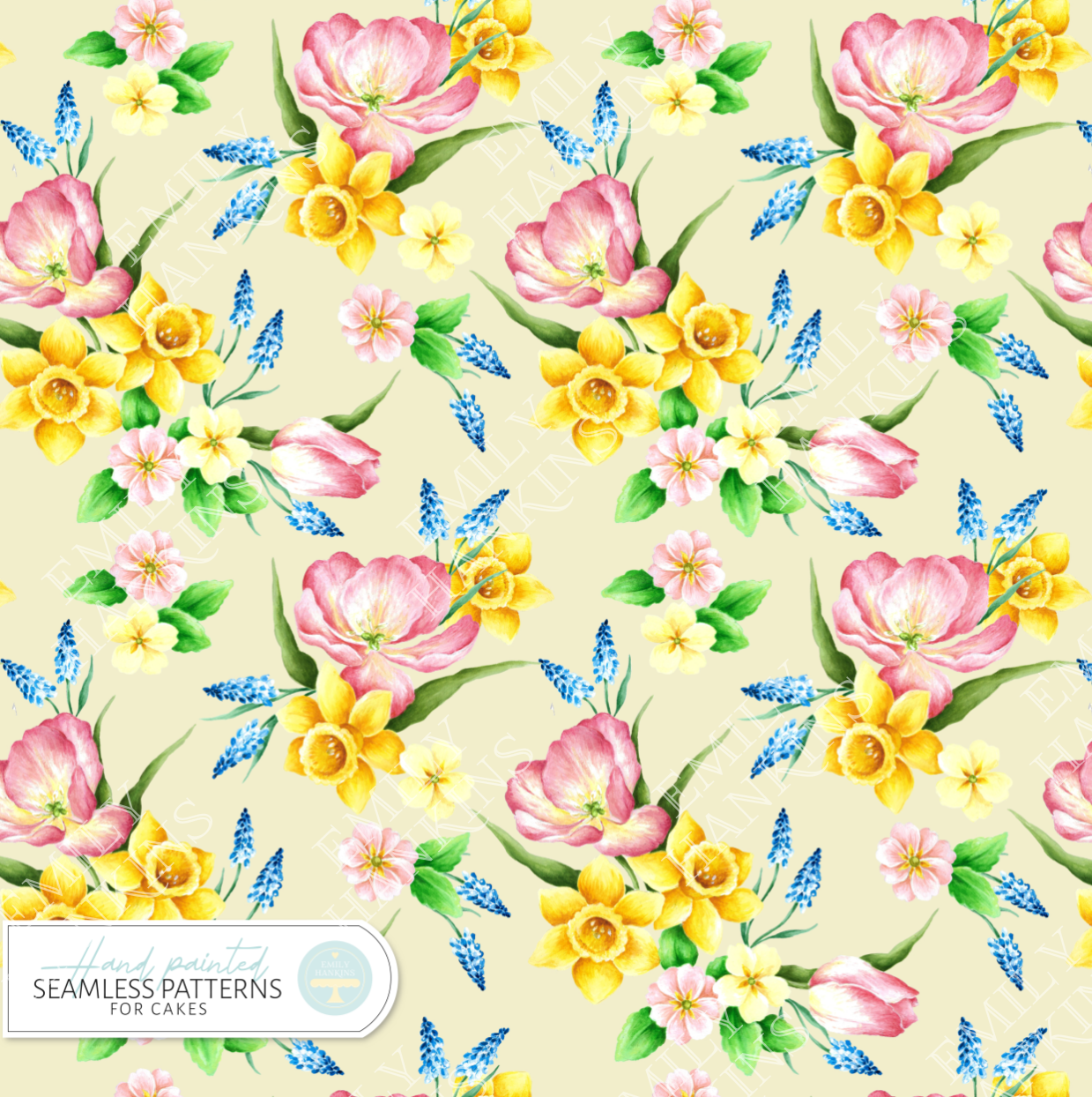 The design is inspired by the joy that spring flowers in the garden bring after a long dark winter. It features tulips, daffodils, muscari and primroses on a lemon background. Each flower has been hand painted by Emily and painstakingly crafted into a seamless pattern for your cake designs.