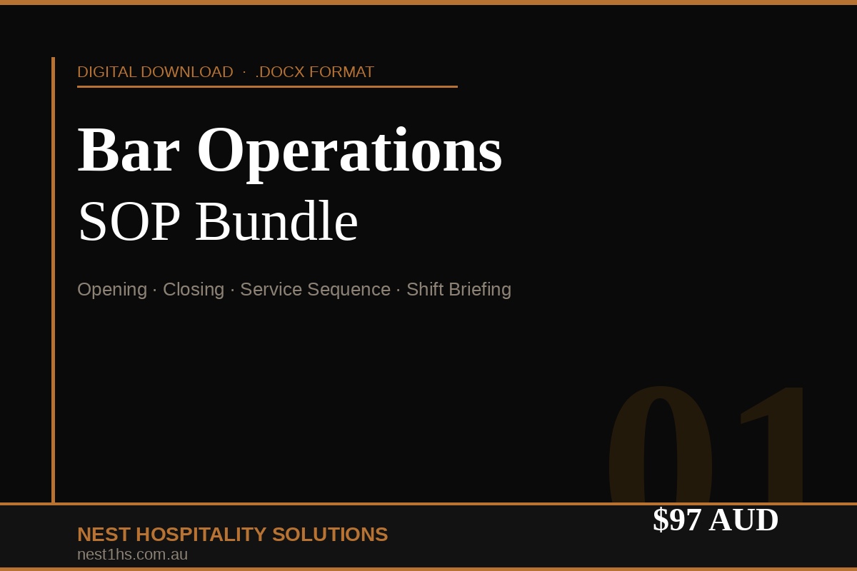 Five core operational documents for Australian bar teams. 28-task opening checklist, 31-task closing checklist, 12-step service sequence with scripts and timing benchmarks, and a 7-section shift briefing template. Manager sign-off lines on every document. RSA compliant, metric, AUD. Editable .docx — customise for your venue.