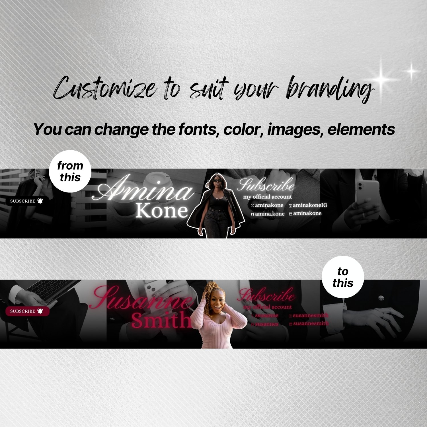 You will receive 5 editable YouTube banner layouts (2560 x 1440 px) that you can customize inside a free Canva account. Change wording, photos, fonts, and colors quickly.