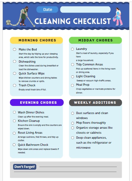Simplify your home cleaning routine with our Daily and Weekly Cleaning Checklist! This easy-to-follow guide breaks tasks into manageable daily sections, covering every room in your home. From dusting and vacuuming to organizing and deep-cleaning, it ensures your household stays spotless in just one week. Perfect for busy families or anyone wanting an organized cleaning schedule!