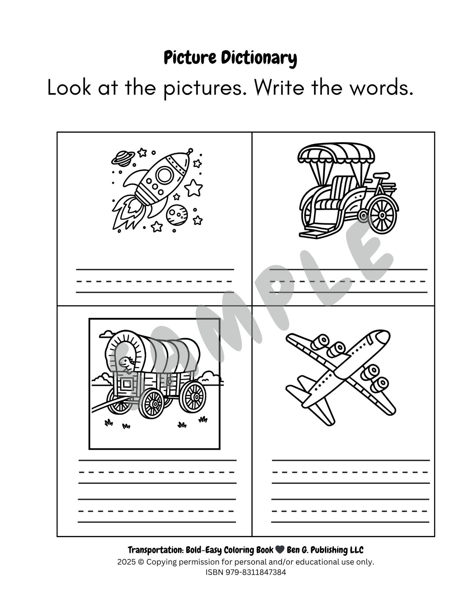 Zoom, soar, and sail into a world of fun with this simple and engaging coloring book! Featuring 48 easy-to-color illustrations, artists of all ages will have a blast bringing cars, trains, boats, airplanes, and more to life with their favorite colors. This book is perfect for improving fine motor skills, creativity, and early learning. It includes downloadable teacher created vocabulary activities and learning extensions. Find the birds and iguanas hiding in these pages and get ready for a colorful adventure on land, air, and sea!