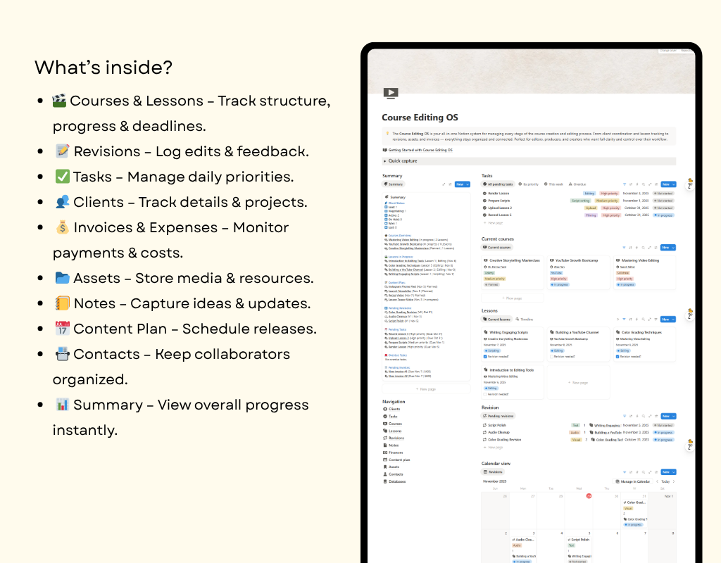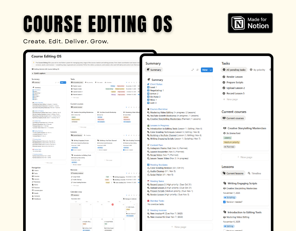 This powerful Notion template brings every aspect of your course creation and editing workflow into one organized system — courses, lessons, revisions, clients, finances, and more — making it easier than ever to plan, produce, and deliver professional-quality content efficiently.
