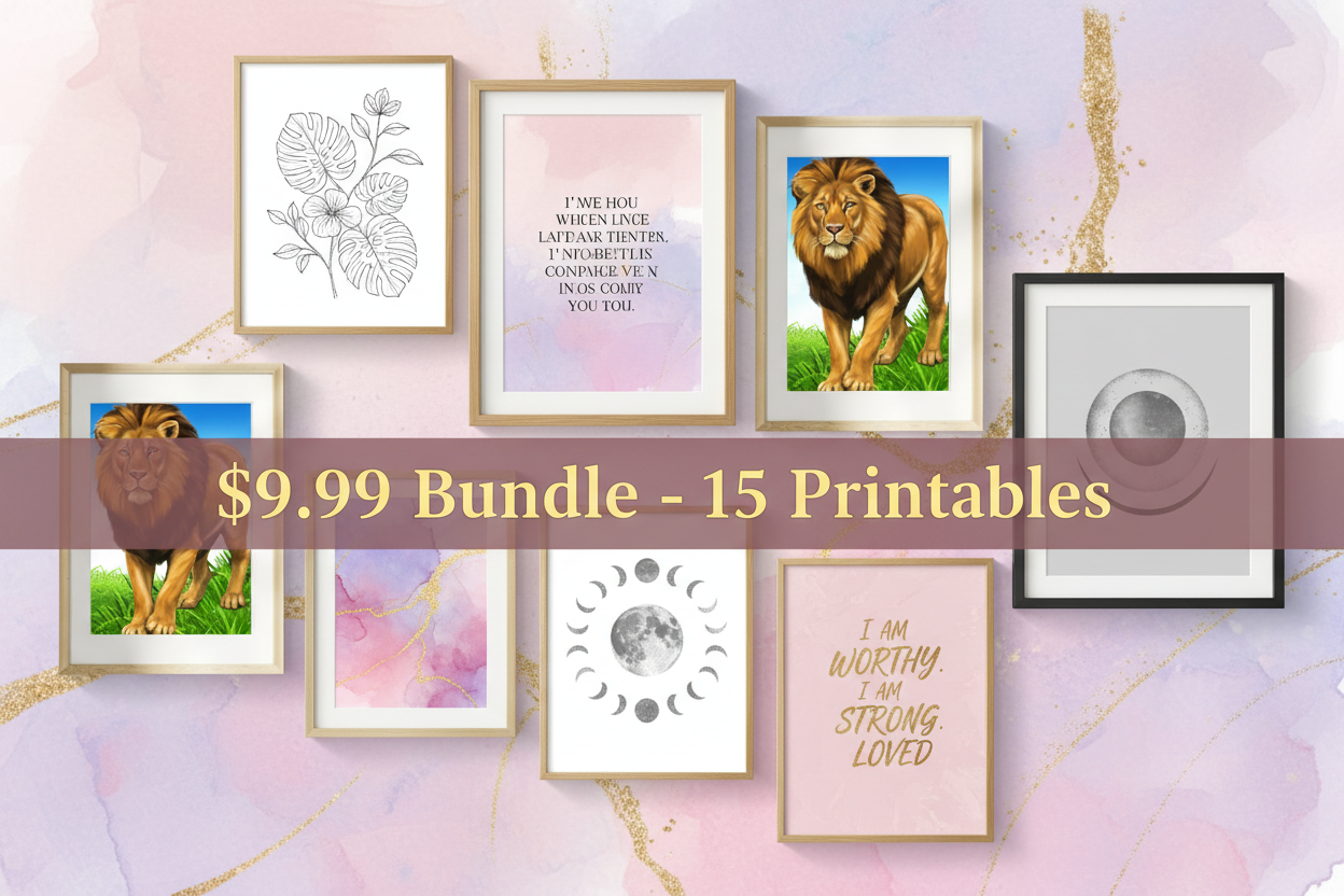 What You Get: 15 high-quality, print-ready wall art designs including: • Motivational quotes ("She Believed She Could," "Good Vibes Only," "Read Lead Succeed") • Inspirational affirmations ("Together We Can," "Take Care of Yourself") • Botanical line art (pampas grass, eucalyptus) • Abstract watercolor designs in soft pinks and lilacs • Celestial moon phases with gold accents • Cute animal illustrations (lion, tiger, panda) • Geometric modern art • Coffee lover quotes • Fashion line art • Dreamy sunset gradients