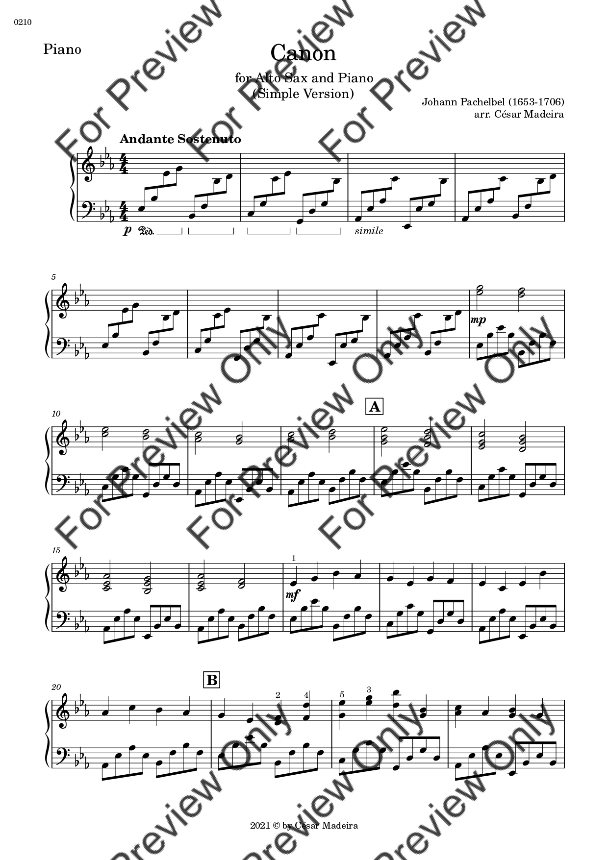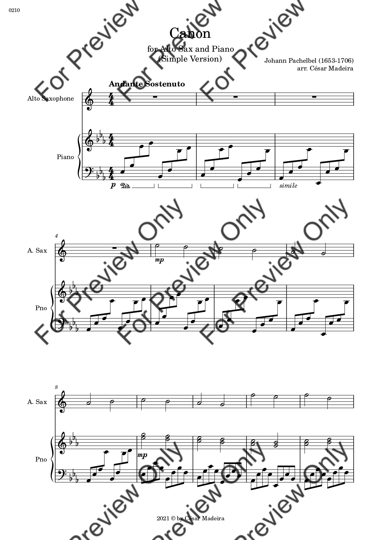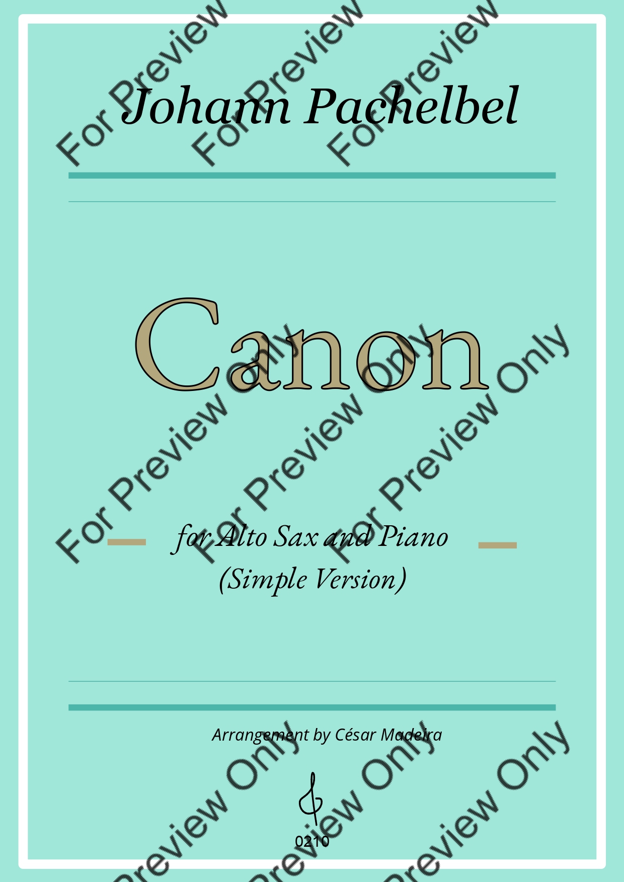 Canon in D by Johann Pachelbel. Arrangement for Alto Sax and Piano. With Full Score and Individual Parts. Have fun!