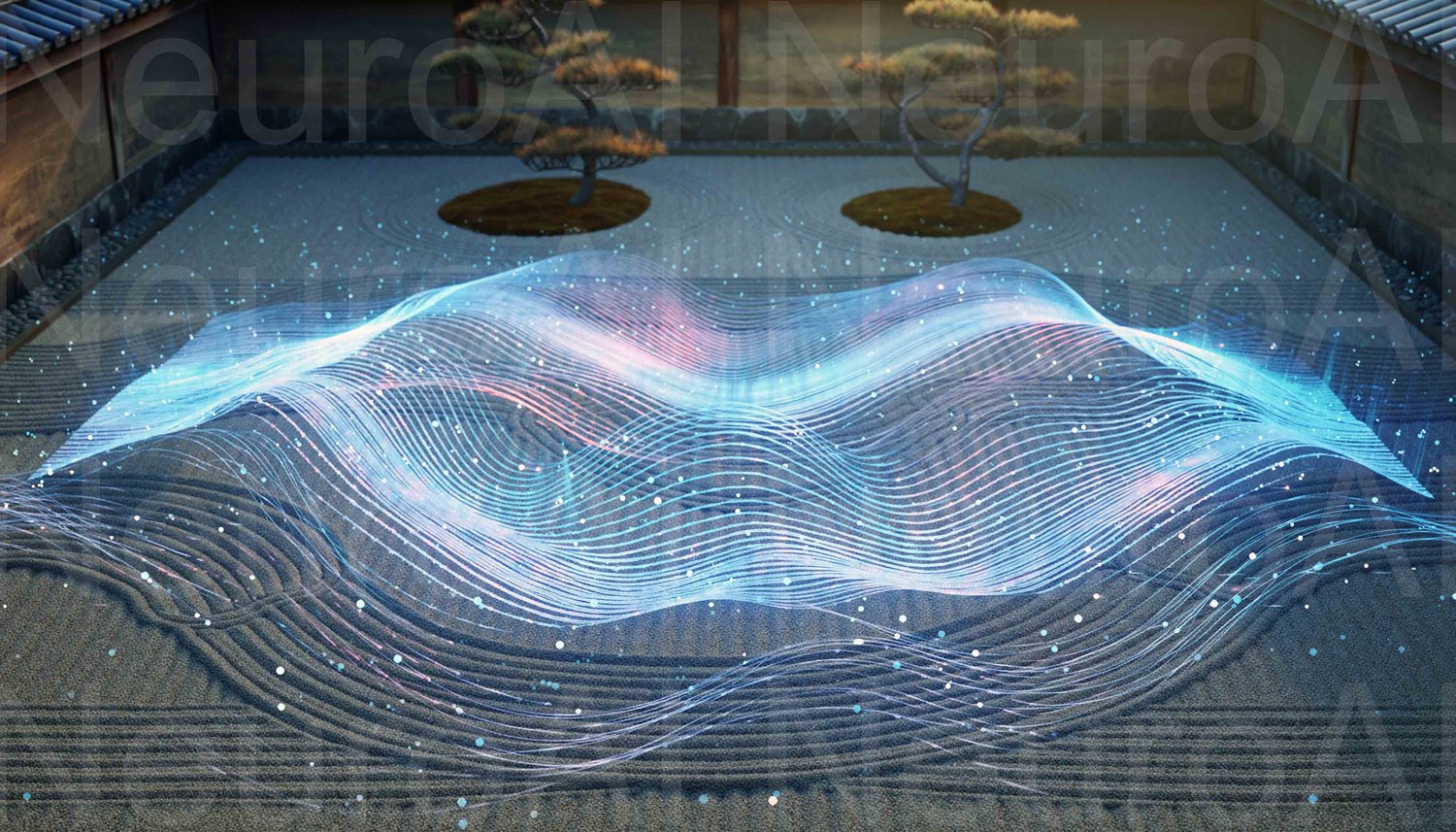Zen garden with vibrant energy visualization overlay