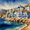 Summer on a Greek island. Sea. Sand beach. White houses. Blue roofs. The beauty of the place. Watercolor.
