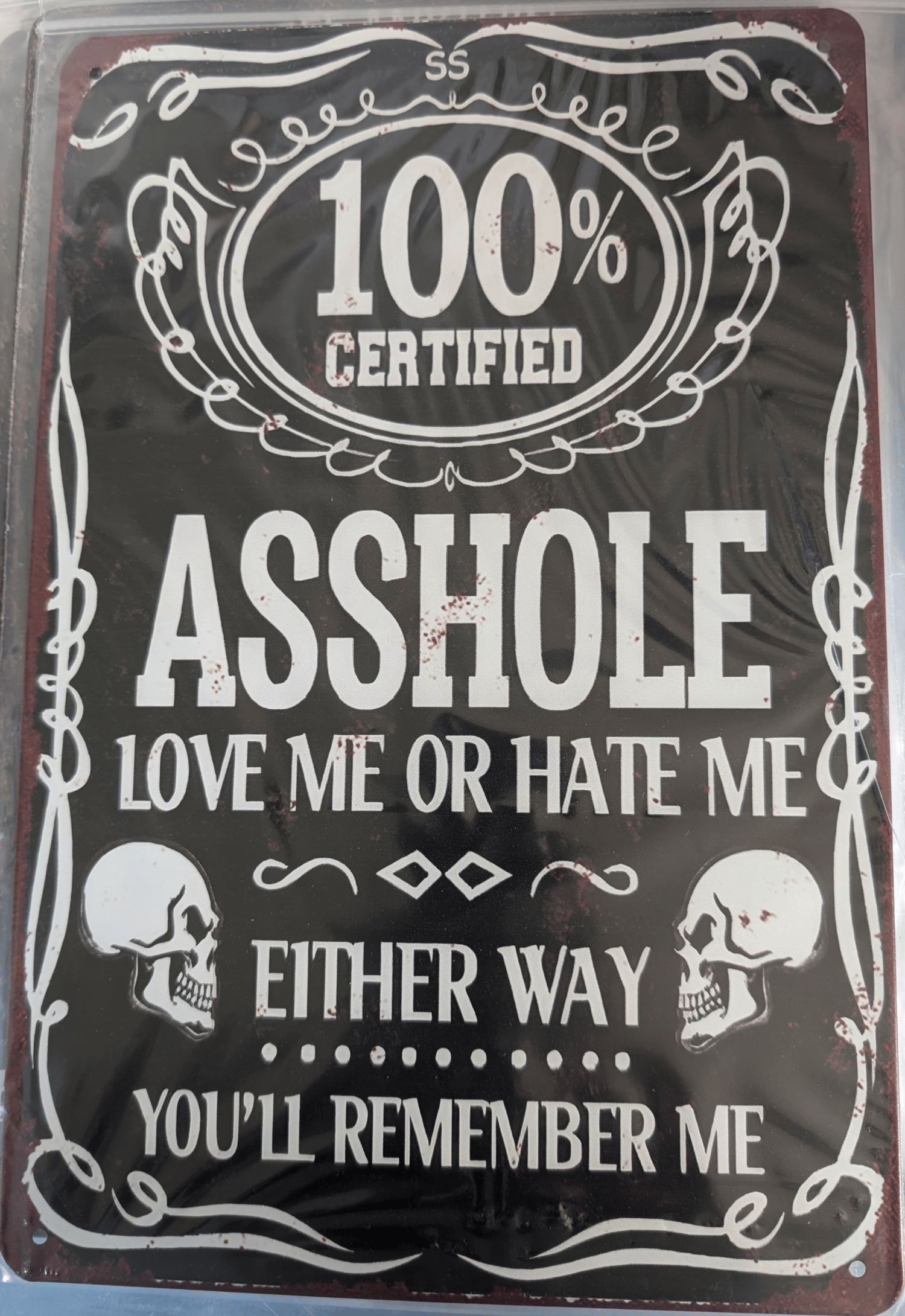 Love me or hate me 100% certified asshole wall art funny. Download, print it, frame it. Choose 8 x 10 or 5 x 7. Buy a frame at any dollar store, flea market, yard sale, or discount store. Keep for your wall or give as a gift. All for less than $5.