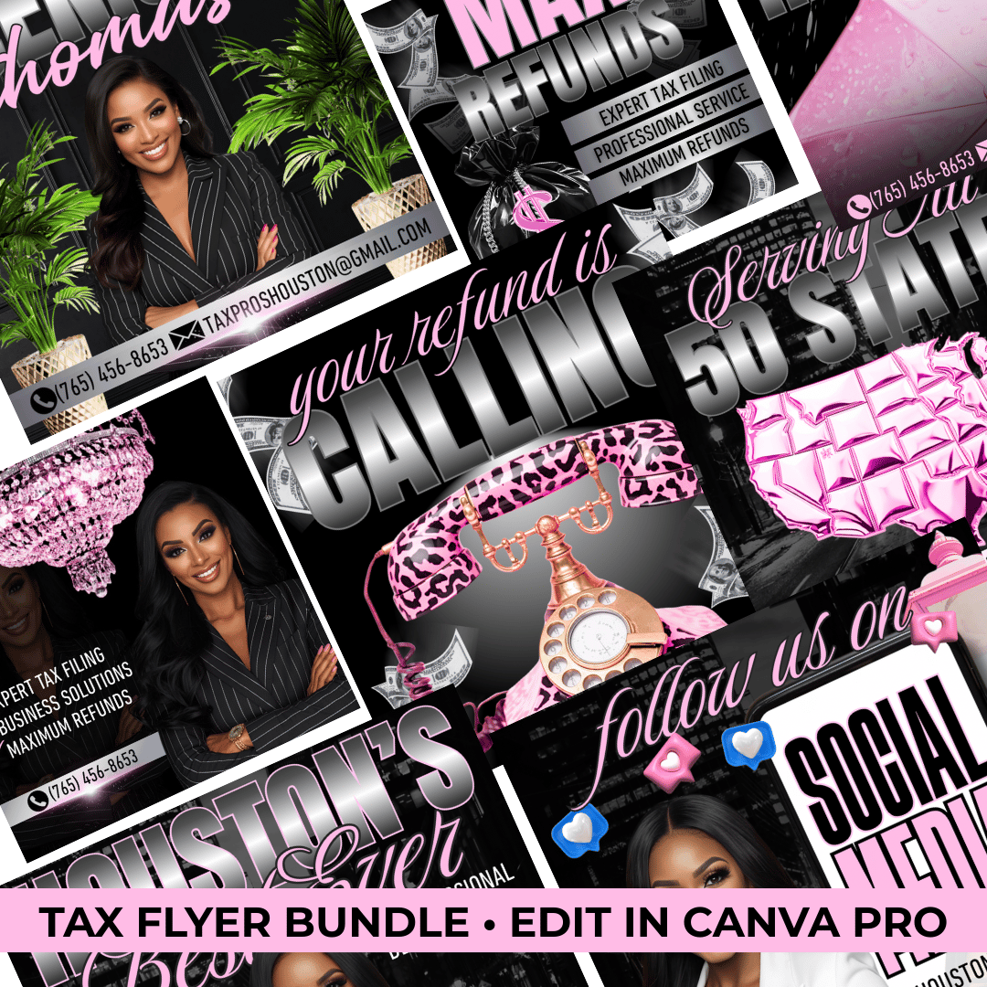 Get your tax business booked and busy this season with this Tax Preparer Canva Flyer Bundle! This set includes 8 high-end, professional marketing flyers designed to promote refunds, tax filing services, and your business across social media and print.