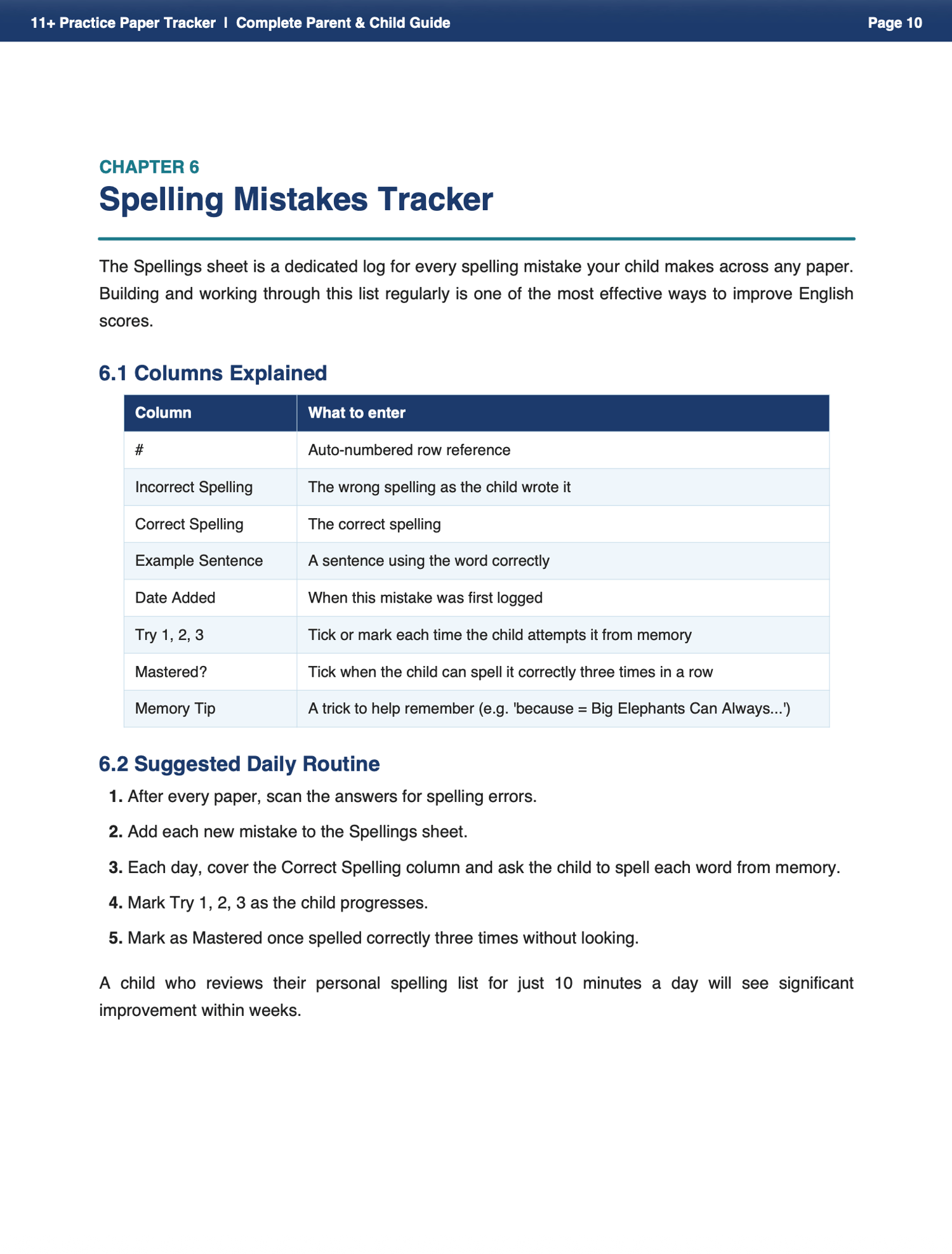 A Spelling Mistakes log your child will actually use Track every spelling error, practise it three times, and mark it as mastered. Ten minutes a day makes a real difference.
