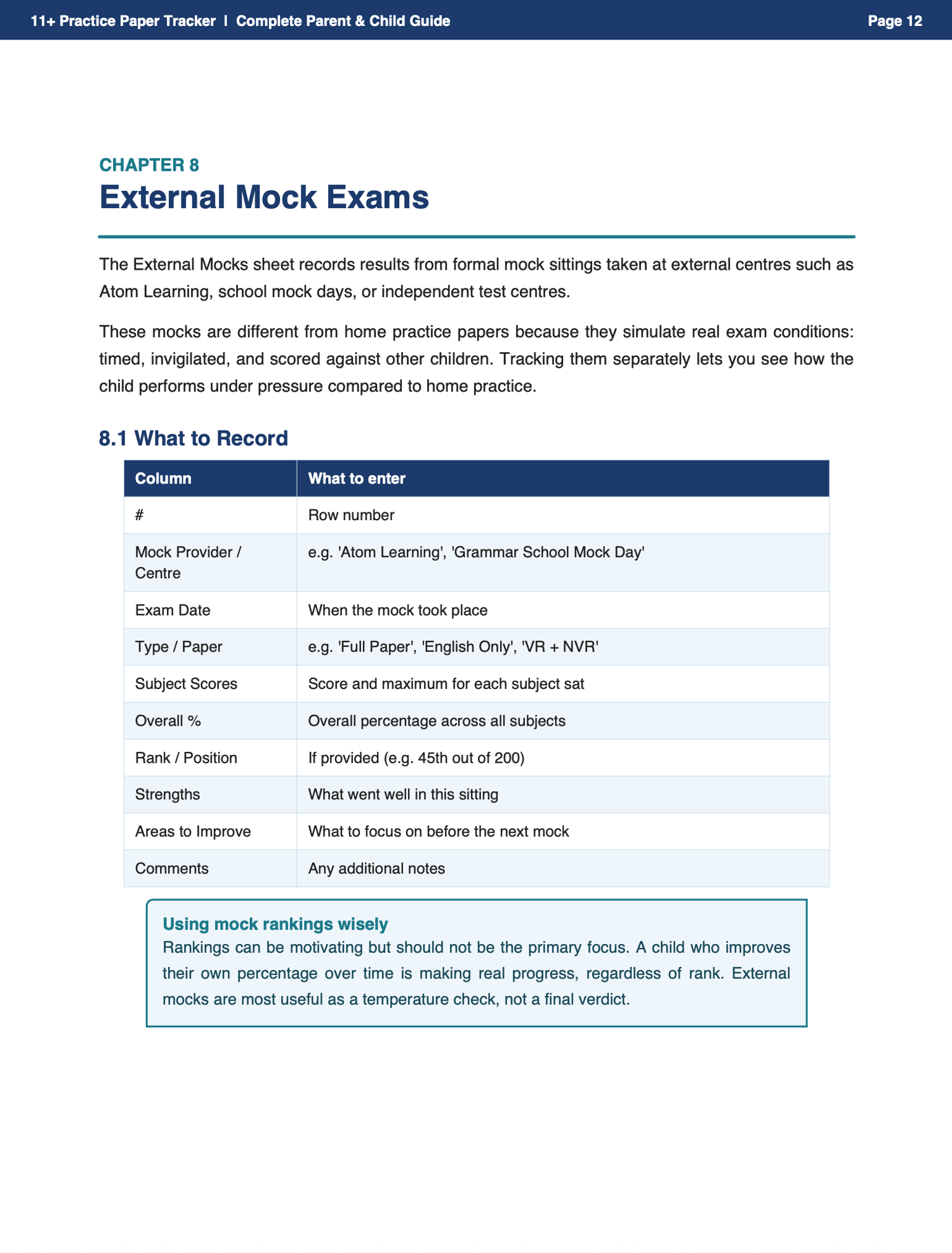 External Mock and Atom Learning sheets Record formal mock results, rankings and patterns to understand how your child performs under real exam conditions.