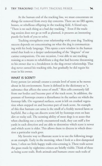 Whether the handlers track for a fun experience with their dogs or desire to pursue an AKC tracking title, Try Tracking provides them with an easily followed method of training...A concise program to train your dog in the spot of tracking that includes excellent tips that will help avoid common mistakes.