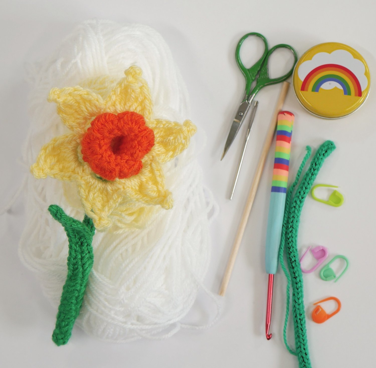 Materials: You will need a 3.5mm crochet hook, 50g DK yarn in green, 50g DK yarn in yellow for your petals & trumpet, scissors, tapestry needle, stitch markers, and your chosen stem for the crochet flower.