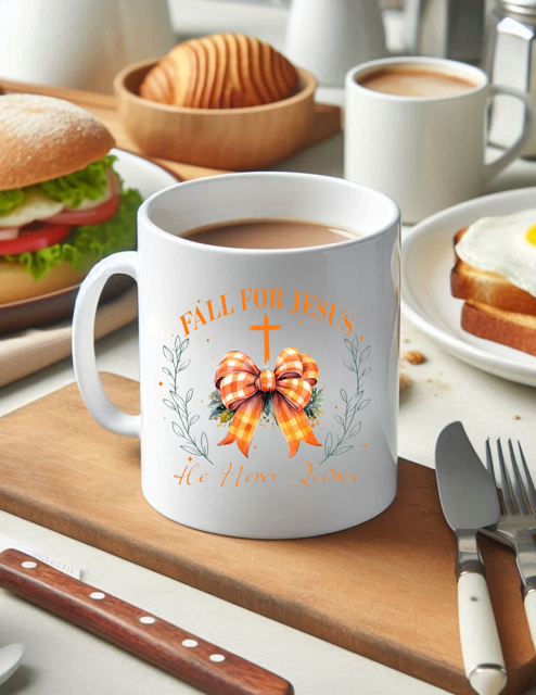 Embrace the season with faith and warmth using this beautifully designed custom mug by Shamrock Kustomz. Featuring the inspiring message "Fall for Jesus - He Never Leaves," along with a festive autumn bow and leafy accents, it’s the perfect way to enjoy your favorite beverages during cozy fall mornings. A thoughtful gift for loved ones or a delightful addition to your seasonal decor!