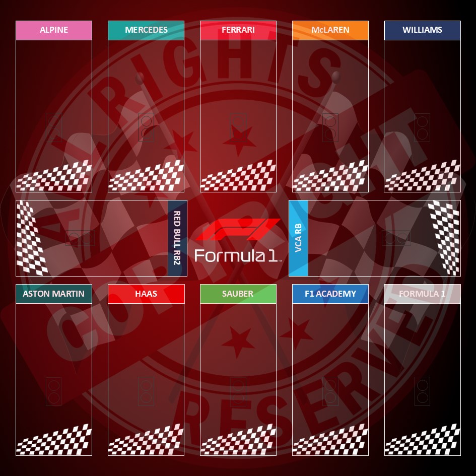Chaque encadré reprend les couleurs officielles des écuries, avec un effet damier stylisé pour mettre en valeur chaque monoplace.