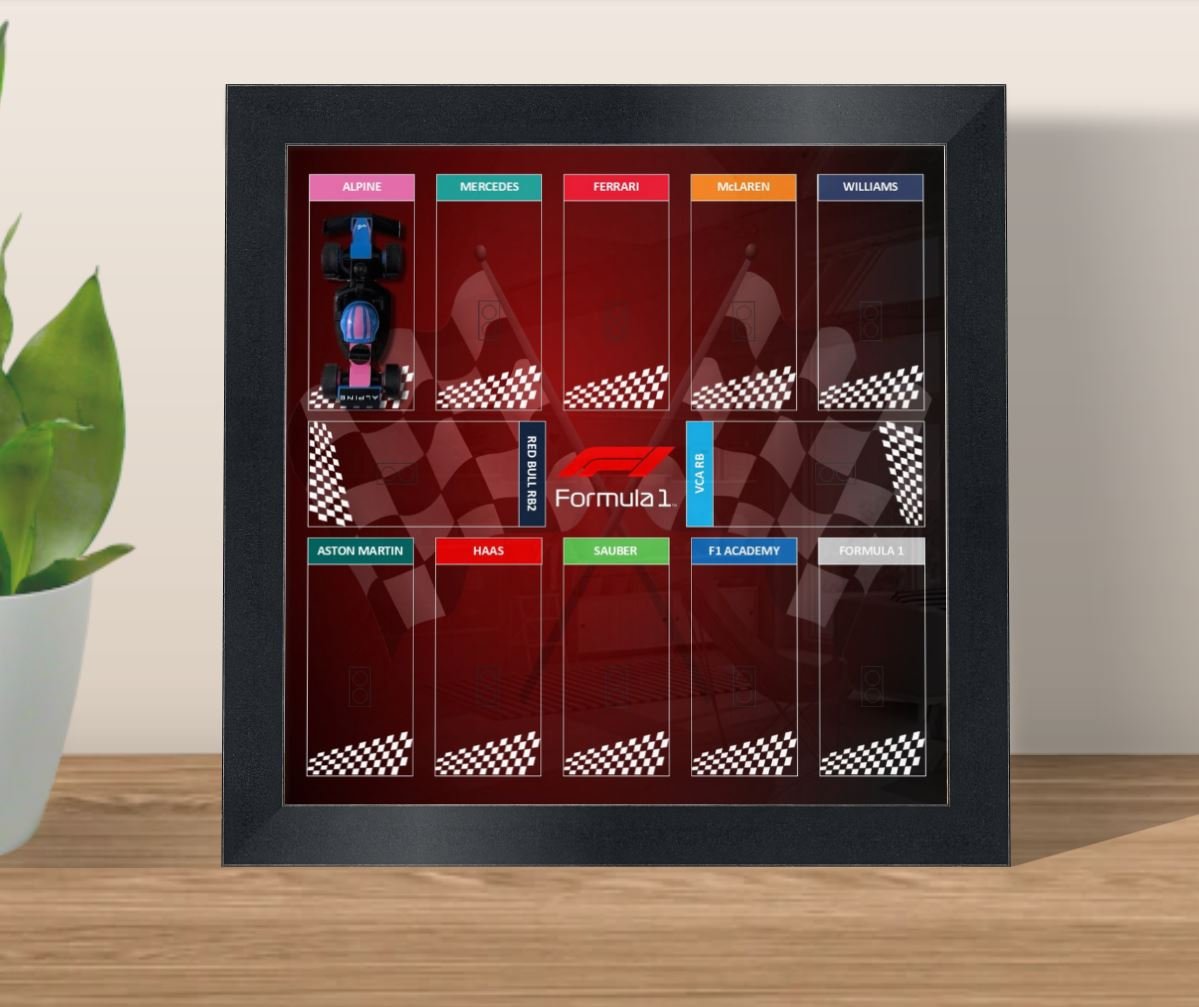 L'affiche inclut les repères précis pour coller une plaque LEGO (type plate 1x2), afin d’emboîter directement ta Mini F1 LEGO. Résultat : une affiche unique, en relief, totalement personnalisée et prête à exposer !