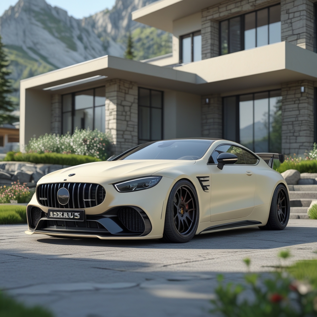 "Hyper-realistic render of an Aspark Owl Sarcoline in pale flesh-colored beige, fully Brabus-customized body kit, featuring matte black mags wheels, parked elegantly in front of a modern luxury mountain house. The house showcases sleek architecture with large glass windows, stone accents, and a landscaped garden with lush greenery, flowering shrubs, and stone pathways. Soft natural sunlight illuminates the scene, casting realistic shadows and reflections on the car's polished surface. Cinematic angle from the front-left of the car, emphasizing its aggressive stance and futuristic design, with high attention to detail and photorealistic textures."