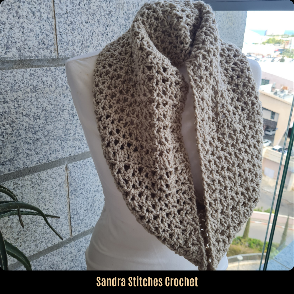 Crochet your own cozy and elegant Aura Infinity Scarf using a simple V-stitch repeat.