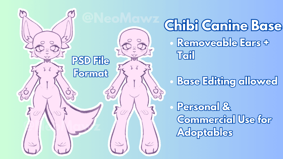 Make your own custom Fursona & Adoptable Designs with this P2U Cute Chibi Canine Base! Comes in PSD File Format. Example Design not included.