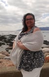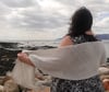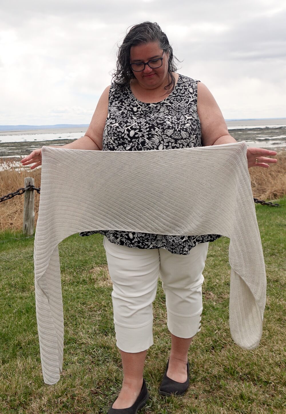 This wrap begins at the bottom left corner, increasing at both edges until the full width is achieved. Then a decrease is worked at one edge while an increase is worked at the other to continue the bias shaping. When the desired length is achieved, decreases are worked at both edges until just a few stitches remain.