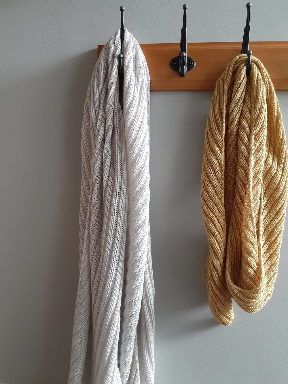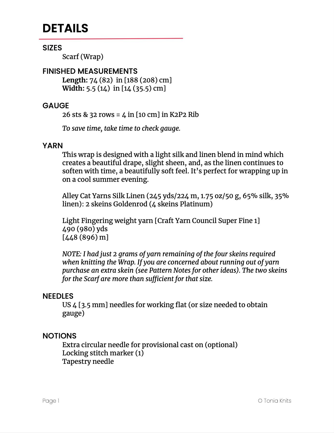 NOTE: I had just 2 grams of yarn remaining of the four skeins required when knitting the Wrap. If you are concerned about running out of yarn purchase an extra skein (pattern alteration ideas included in Pattern Notes). The two skeins for the Scarf are more than sufficient for that size.