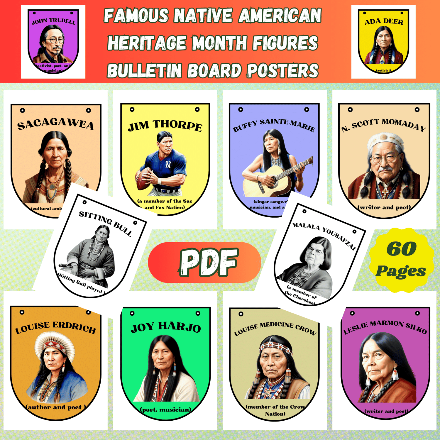 Famous Native American Heritage Month figures Bulletin Board Posters feature images and information about prominent individuals from Native American history, culture, and activism. These posters are designed to educate and celebrate the contributions of Native Americans to society.