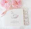 Dans la collection : Signets souvenir, faire-parts et enveloppes coordonnés, marque places, étiquettes pour dragées et menus.