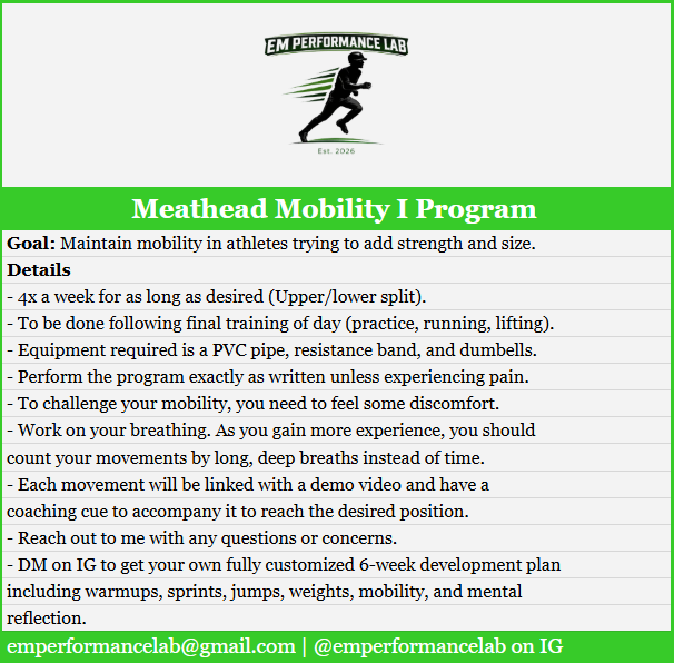 Meathead Mobility I is the perfect mobility/stretching routine for those who are lifting regularly and trying to build strength and size but don't want anything too complicated. Added strength and size do you no good without the ability to move well. All movements include a demo video and coaching cues to reach the desired positions. Get your Meathead Mobility I program today and challenge your ability to move!