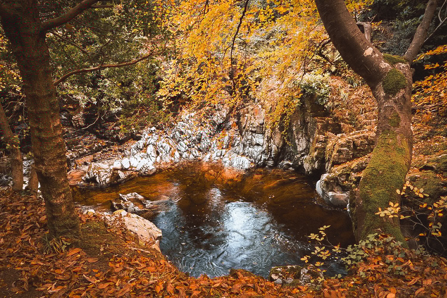 This calm woodland pool sits beneath arching trees dressed in autumn colour, reflecting rock, leaves, and soft light along its surface. The scene feels enclosed and peaceful, a natural pause along the forest trail.