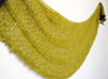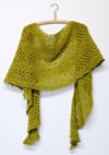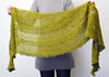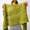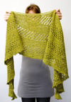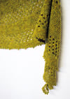 Lime Chamraj is an asymmetrical crescent-shaped shawl made of garter stitch and simple eyelet lace. Alternating sections of eyelets and garter-stitch wedges shaped with short rows make both relaxing and stimulating knitting. The sweeping garter-stitch sections give an unusual shape to the shawl.